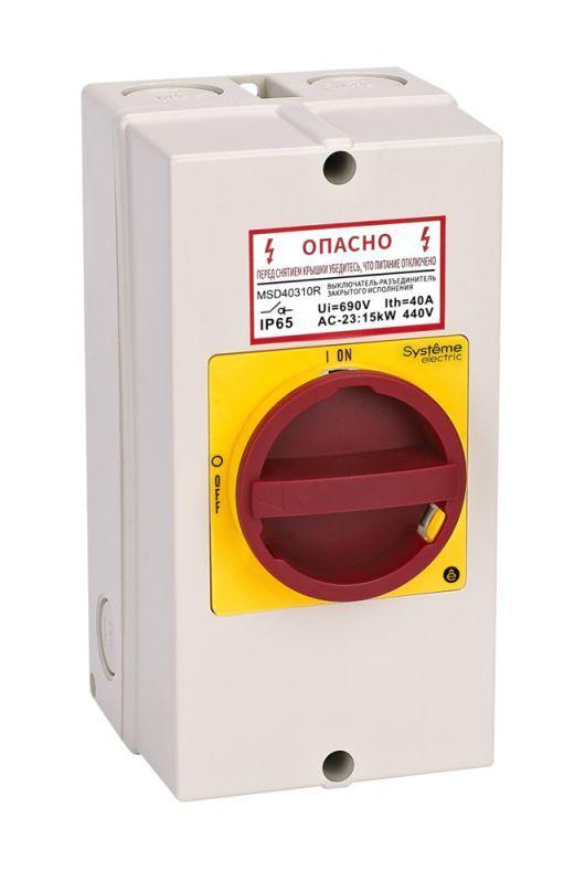 Выключатель-разъединитель MSD в корпусе IP65 на номинальный ток 40 А. Может использоваться в качестве главного аварийного выключателя. Применяется для коммутации силовых электрических цепей активной, индуктивной или смешанной нагрузок, может использоваться для включения и отключения двигателей категорий применения AC–3 и DC–3. 3-полюсное исполнение, красная поворотная рукоятка с возможностью блокировки навесными замками.