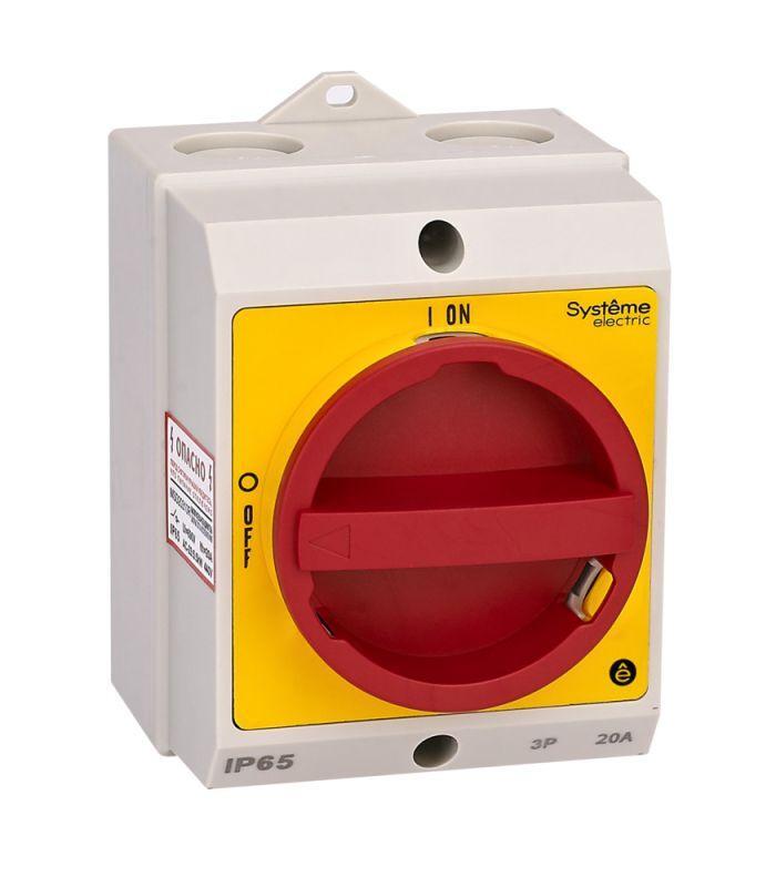 Выключатель-разъединитель MSD в корпусе IP65 на номинальный ток 20 А. Может использоваться в качестве главного аварийного выключателя. Применяется для коммутации силовых электрических цепей активной, индуктивной или смешанной нагрузок, может использоваться для включения и отключения двигателей категорий применения AC–3 и DC–3. 4-полюсное исполнение, красная поворотная рукоятка с возможностью блокировки навесными замками.