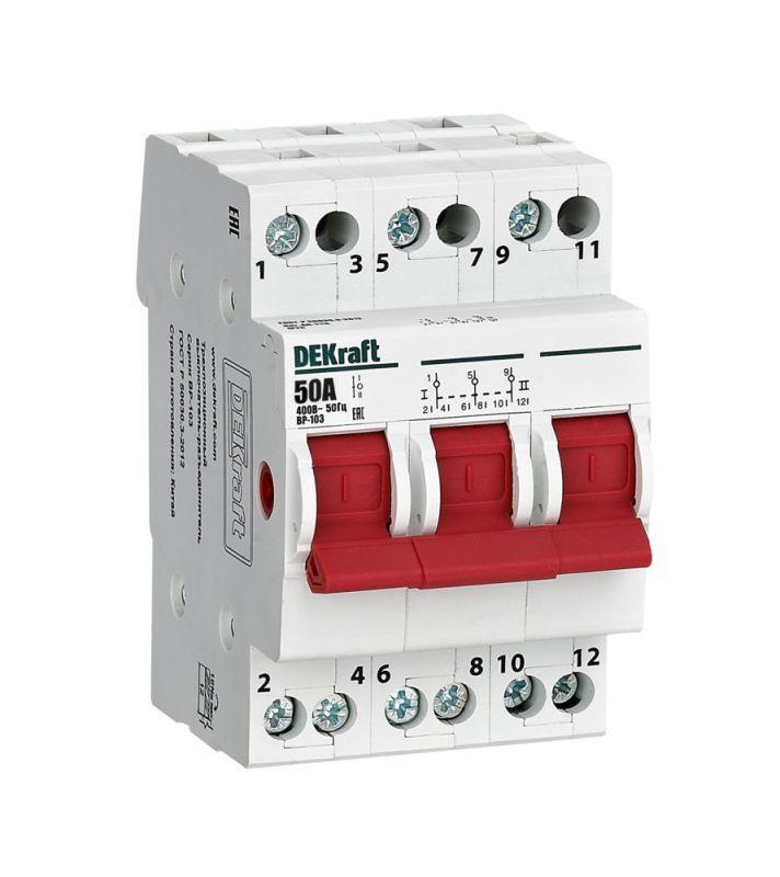 Выключатель-разъединитель трехпозиционный серии ВР-103 Dekraft, 3-полюсный; номинальный ток 50 А, установка – на 35мм DIN-рейку, установочное положение - любое, с красной рукояткой управления. Категория применения AC-22B. Применяется для ручного включения / отключения от сети отдельных групп потребителей с напряжением 400В AC в распределительных, учетно-распределительных щитках. Включая переключения с основной сети на резервную в системах ручного ввода резерва. Сечение подключаемых проводников 10 мм2, расположение - в шахматном порядке.