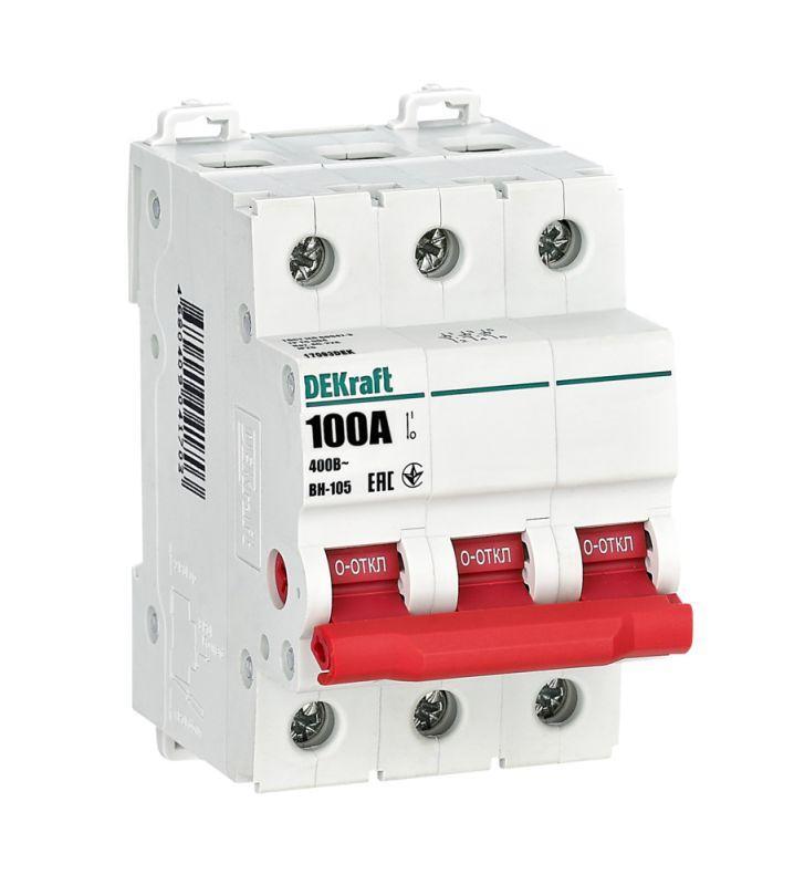 Выключатель-разъединитель серии ВН-105 Dekraft, 3-полюсный; номинальный ток 100 А, установка – на 35мм DIN-рейку, установочное положение - любое, с красной рукояткой управления. Высокие характеристики механической и электрической износостойкости. Категория применения AC-22A. Применяется для ручного включения/отключения сетей напряжением 400 В AC. Специальные мостиковые контакты обеспечивают надежный разрыв цепи; они полностью исключают возможность перекрытия дугой по изоляции.