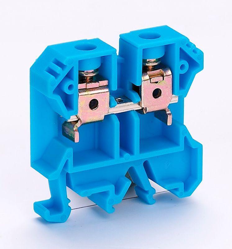 Зажим наборный серии ЗН-101 Dekraft ; номинальный ток - 100 А; сечение проводов от 1 до 16 кв.мм; цвет and ndash; синий; материал корпуса - полиамид; материал клемм и винтов and ndash; латунь; монтаж - защелкиванием на DIN-рейку; количество в упаковке and ndash; 50 шт. Клемма выполнена таким образом, что обеспечивает двойной обжим проводника. Это обеспечивается в том числе и за счет насечек на клеммах. Зажимы наборные синего цвета применяются для присоединения нулевого рабочего проводника.