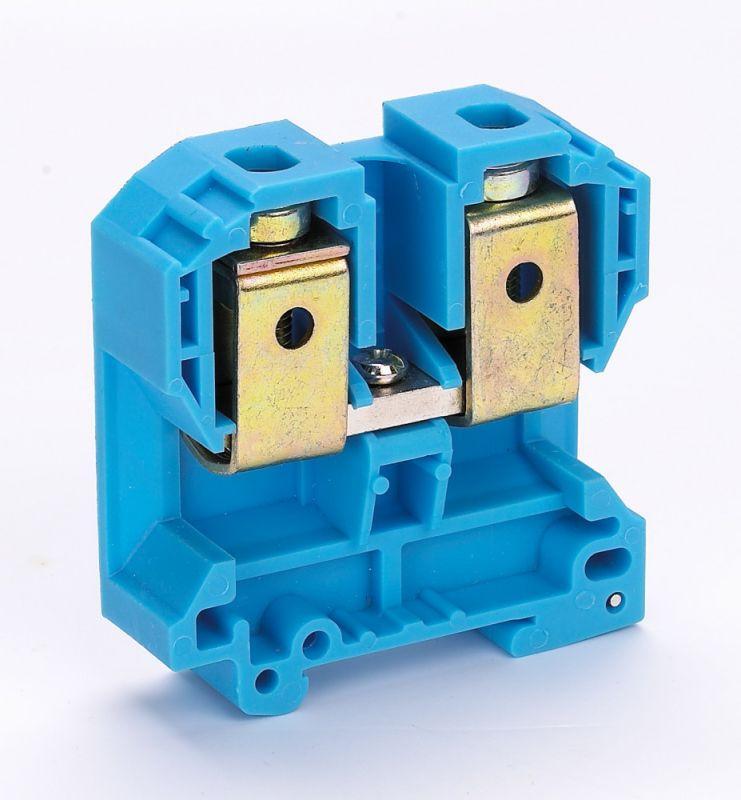 Зажим наборный серии ЗН-101 Dekraft ; номинальный ток - 250 А; сечение проводов от 16 до 70 кв.мм; цвет and ndash; синий; материал корпуса - полиамид; материал клемм и винтов and ndash; латунь; монтаж - защелкиванием на DIN-рейку; количество в упаковке and ndash; 9 шт. Клемма выполнена таким образом, что обеспечивает двойной обжим проводника. Это обеспечивается в том числе и за счет насечек на клеммах. Флажок под зажимом предотвращает случайную установку проводника ниже зажима.