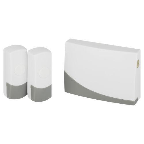 Беспроводной электрический дверной звонок с двумя кнопками, защищёнными от влаги и пыли. Отличное решение для дачи или загородного дома, когда на территорию есть разные входы. Для каждой кнопки своя полифоническая мелодия. Звонок работает от батареек: 1 шт А23 для кнопки (входит в комплект), 2 шт АА пальчиковые для динамика (в комплект не входят). Аккуратный бело-серый дизайн актуален для любого интерьера. Приятная упаковка делает данный звонок хорошим подарком на новоселье и другие праздники.